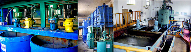 | 工艺流程说明: 钝化浓缩液用提升泵将浓缩液输入到还原池内,通过计量泵将硫酸液加入还原池内,使还原池pH值达到2-3,然后通过计量泵将还原剂亚硫酸加入还原池内,将六价铬还原为三价铬。经过还原处理的钝化液和前处理,镀锌、镀镍水洗水进入大调节池中,各种废水在调节池中经过充分的均化后经提升泵提升至反应池1中,通过计量泵进入CaCl2,以破坏Zn2+的络合物,在反应池2中通过计量泵进入NaOH,调节pH值在9-11范围内,然后废水流入反应池3中,通过计量泵进入助凝剂PAM后进入斜板沉淀池中,金属氢氧化物形成污泥沉入污泥斗中,上清液自流进入中和池进行酸碱调节,调回pH值在6-9范围内,然后排放。斜板沉淀池中污泥定期排放至污泥池,用厢式压滤机处理成泥饼后外运深埋,污泥水返回调节池。 电镀废水处理设备由调节池、加药箱、还原池、中和反应池、pH调节池、絮凝池、斜管沉淀池、厢式压滤机、清水池、气浮反应,活性炭过滤器等组成。 离子废水在电镀废水中的应用 离子交换在电镀废水处理中可起有害离子交换作用,可起到从废液中去除某项杂质的净化以及浓缩稀溶液等作用。 •去除有害离子的置换 置换就是将溶液中某一种离子转换成另一种所需要的离子。如含铬废水中的 Cr 2 O 7 ˉ 与阴离子交换树脂上的 OHˉ 置换。 树脂起置换作用时,应对离子有较大亲和力,需要将树脂转变成所需的形式,如含镍废水中的镍,利用 Na 型弱酸阳离子交换树脂很容易置换,置换后用酸洗脱,因此,洗脱后需要将 H 型树脂转成 Na 型。 •废液杂质的去除 利用离子交换处理含铬废水中设置用阴离子交换树脂可去除水中菲酸阴离子;用阳离子交换树脂净化铬酸回收液、镀铬(或钝化)废镀液等去除溶液中的三价铬、铁等杂质离子回收铬酸等。 •浓缩稀溶液,回收再生液 离子交换也可作为浓缩离子的一种手段,某些情况比蒸发浓缩更为经济。电镀废水一般浓度比较低,利用离子交换进行富集浓缩后,再生时用少量 再生液把它 从树脂上洗脱下来,就能得到浓度较高的回收液。 | ||||