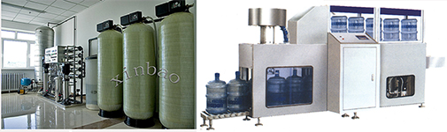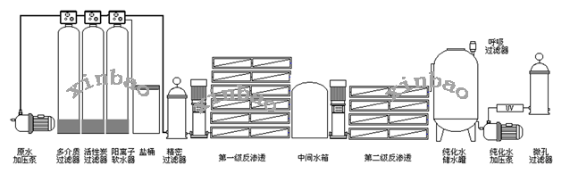 自来水加压泵-多介质过滤器-活性炭过滤器-软水器-保安过滤器-二级反渗机-臭氧发生器-不锈钢储水罐-聚酯桶装设备
